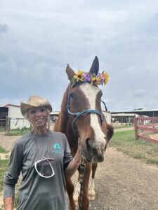 At CTRC, Julie volunteers in a variety of roles. She serves as a horse leader and sidewalker in lessons, helps train new volunteers, participates in the schooling and conditioning team, and even cares for herd member Handsome as a barn buddy. Beyond these hands-on responsibilities, Julie brightens the center in countless ways—planning events, decorating for the seasons, and bringing snacks to keep the volunteer team energized.