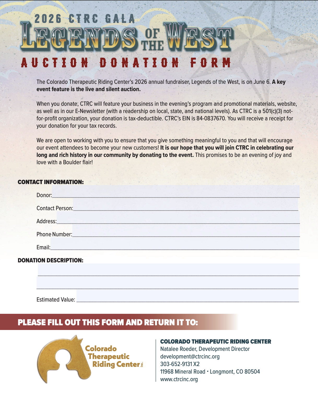 If you would like to be an official event sponsor or donate an auction item, please click here, complete the respective form, and submit it to CTRC’s Development Director, Natalee Roeder, at [email protected]. You may also reach Natalee directly at 720.336.1467.